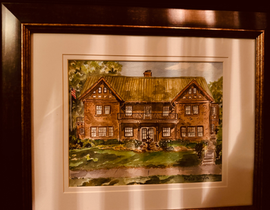 The Receiving Gallery is just on the north side of the Antechamber. Once you step foot through the Beaux Arts stained glass grand entrance door, you have entered the heart of the cottage. In this gallery, HSH Mikhail greets all his visitors to his home. On your right is a mirrored door that takes you into the Bell Room; this is where the phone table and chair from the turn of the last century are kept with the telephone. Alexander House had one of the very first phone systems in Waseca. The phone calls coming and going must have been of the utmost importance to render it, its own room. The prints above the phone are original Charactures of Oliver Wendell Holmes and Sir Richard Owen. On your left is a walnut inlaid demi loon gallery table, and on it sits an antique Chinese Rose Medallion Bowl in between two cast brass sitting camels from the Middle East. Below on the lower shelf is a large hand-carved black alabaster bowl and two blue mouth-blown hand-painted enamel glass vases. On the wall above are two English oil paintings of gun hounds. In the center of the wall sits a small walnut Etagere with a bronze called Improvisateur by Ferrand from the 1800’s.